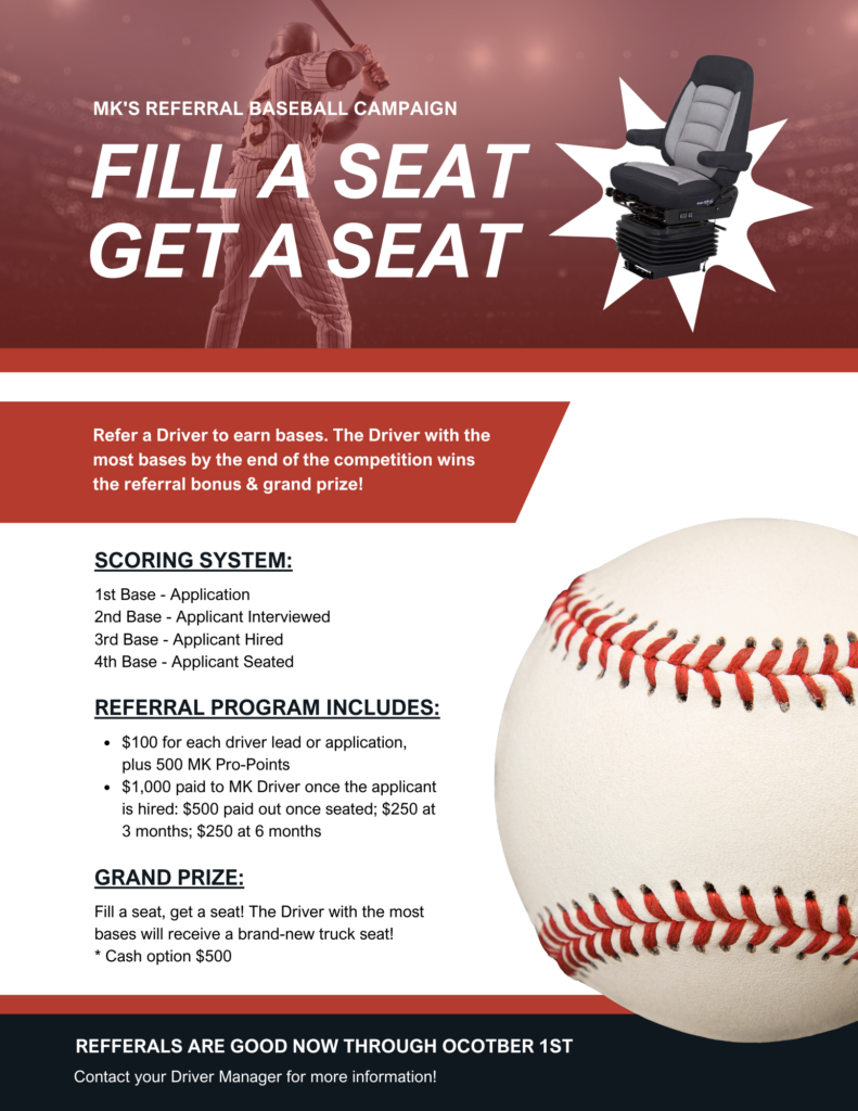 Have you come across our “I Spy” Stickers yet? These stickers have been placed in different spots on some of our trailers. The goal is when you complete a thorough pre-trip inspection and find a sticker, you will be rewarded with MK Pro-Points.