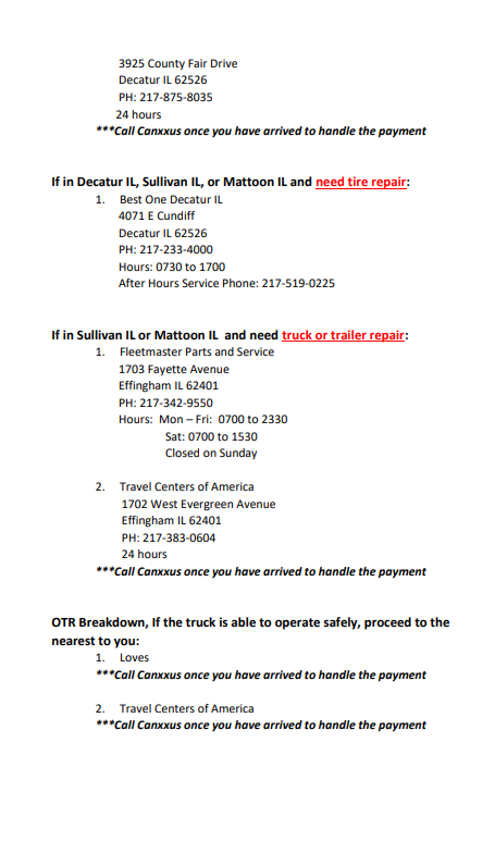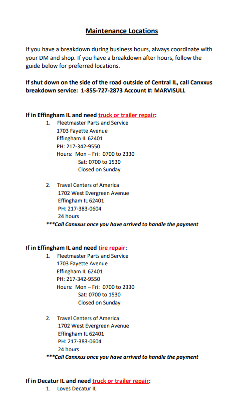 If shut down on the side of the road outside of Central IL, call Canxxus breakdown service: 1-855-727-2873 Account #: MARVISULL