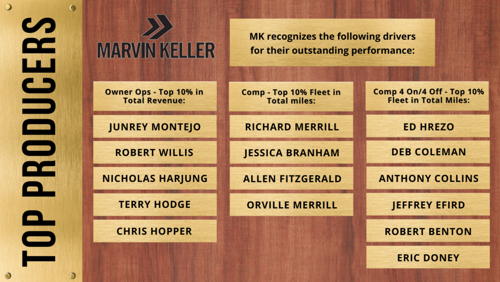 Each quarter, the Producer Badge is awarded to drivers who are in the Top 10% of the fleet in which they exceed the quarterly productivity goals. This badge symbolizes the driver’s hard work and success within Marvin Keller.