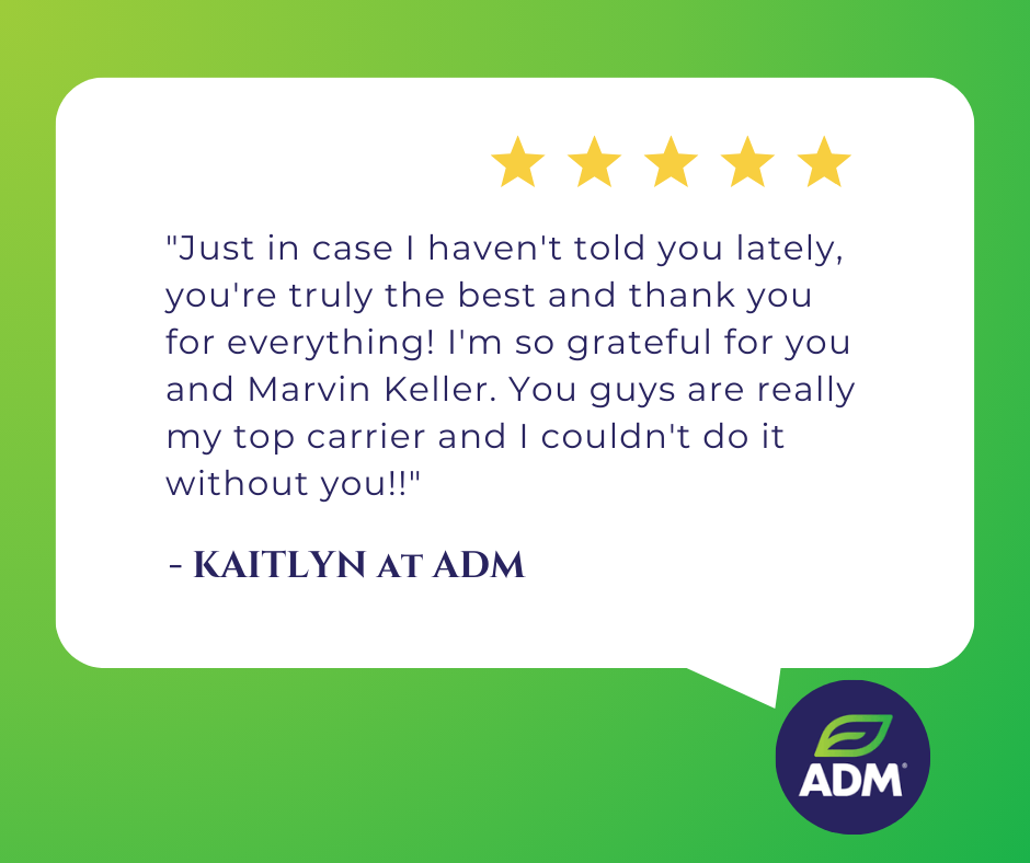 We are honored to receive such positive feedback from our customers, like Kaitlyn at ADM, who recently acknowledged our top-quality service. We would like to extend our gratitude to you guys for representing Marvin Keller so well and providing excellent customer service. Keep up the great work everyone!