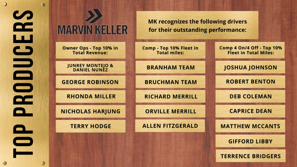 Each quarter, the Producer Badge is awarded to drivers who are in the Top 10% of the fleet in which they exceed the quarterly productivity goals. This badge symbolizes the driver’s hard work and success within Marvin Keller.