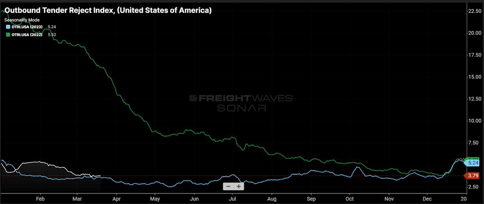 One tool that quickly shows the strength of the market is the Outbound Tender Reject Index, produced by the trucking industry company Freightwaves. This just measures how much-contracted freight carriers are declining from their customers. The more freight they decline, the better the market is for carriers as they are getting other freight or better offers. Conversely, the fewer freight carriers are declining, the fewer options they have and the more dependent they are on everything they can get.