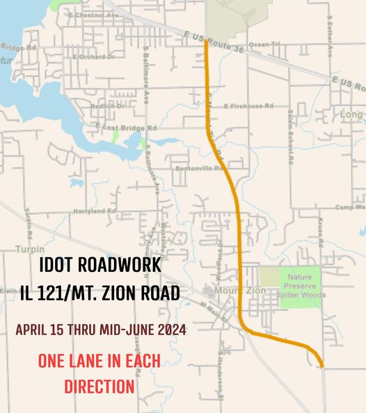 The Illinois Department of Transportation is resuming work on IL-121/Mt. Zion Road April 15, 2024. Traffic will be restricted to one lane in each direction at times.