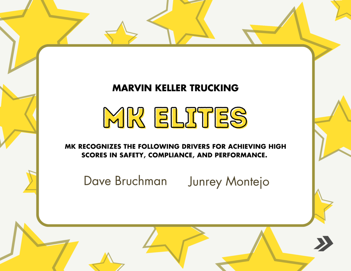 Each quarter, the Producer Badge is awarded to drivers who are in the Top 10% of the fleet in who exceed the quarterly productivity goals. This badge symbolizes the driver’s hard work and success within Marvin Keller.